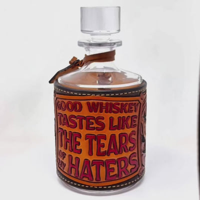 The 26 oz lead-free glass decanter itself is high quality and meant to be used and enjoyed at the bar. It serves as a clean canvas for the leather art and gives the finished piece its purpose.